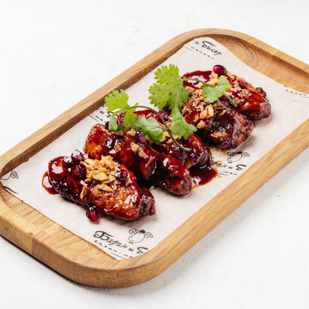 Крылья куриные, соус наршараб, соус барбекю, бульон куриный, лук кранч, гранат зерно, кинза