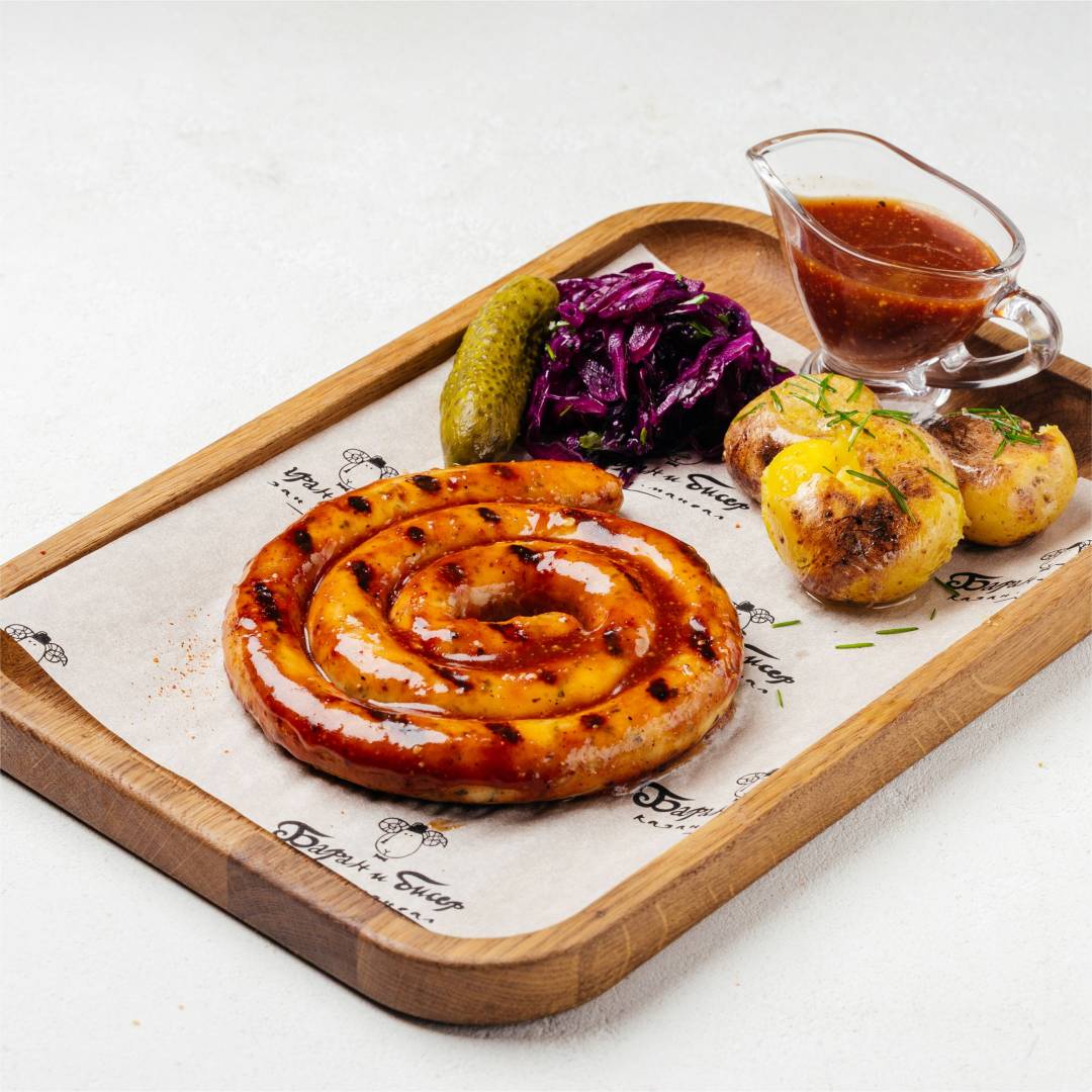 Колбаски куриные, капуста красная маринованная, огурец маринованный, картофель печеный мини, соус барбекю, цедра апельсина, чеснок, соевый соус, специя сациви, лук зеленый