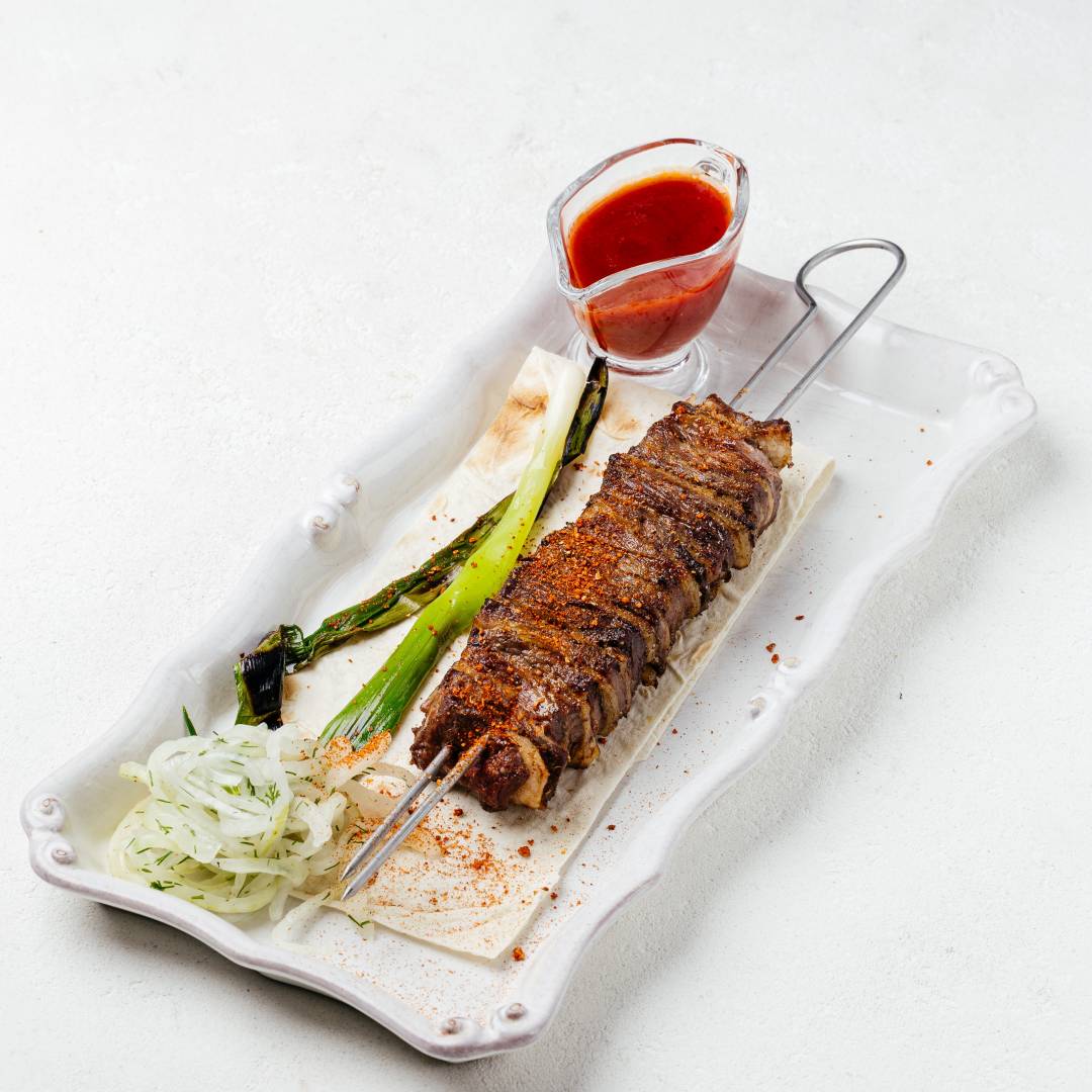 Шашлык-сэндвич из говядины, маринованный лук с зеленью, лаваш, соус сацебели, зелёный лук