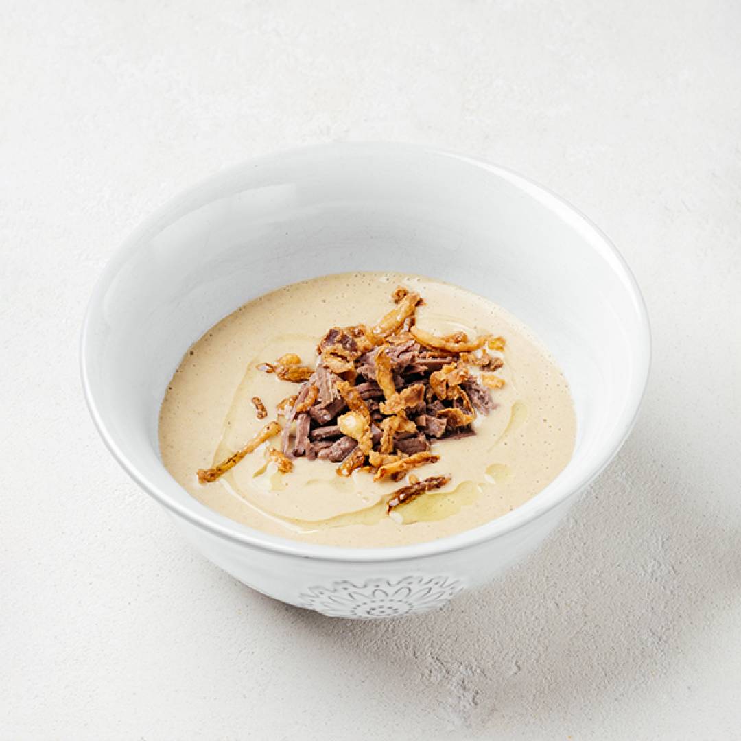 Свёкла, говядина, брынза, микс зелени, красный лук, зёрна граната, имбирная заправка с ткемали, специя сациви