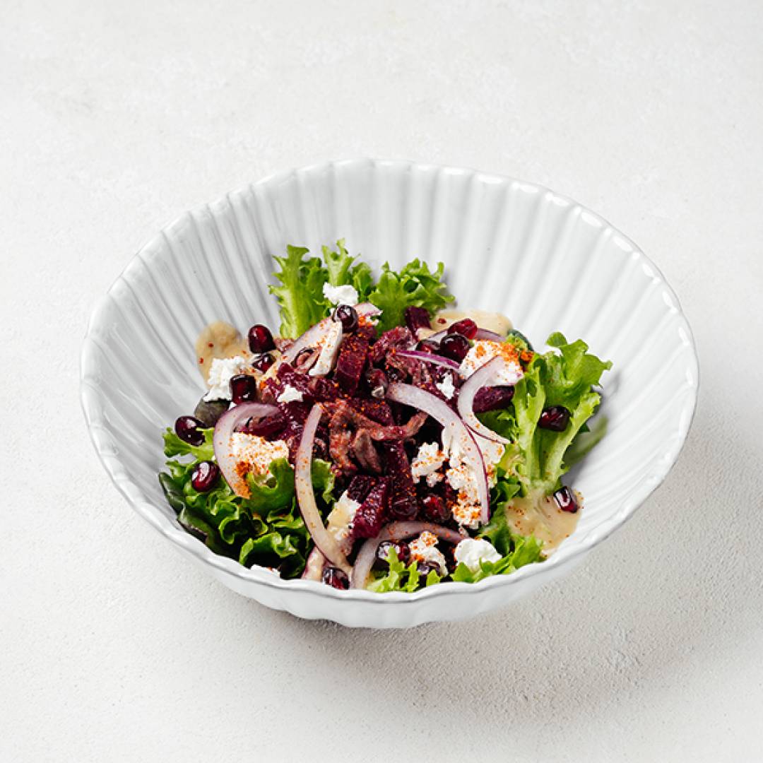Свёкла, говядина, брынза, микс зелени, красный лук, зёрна граната, имбирная заправка с ткемали, специя сациви