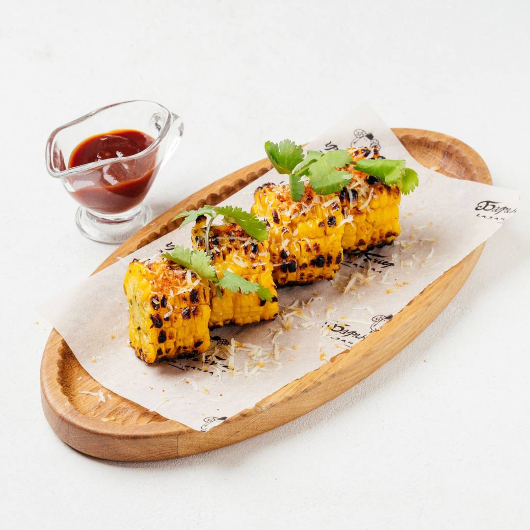 Кукуруза, сыр проволоне копченый, сациви, кинза, соус барбекю, соус лимонный