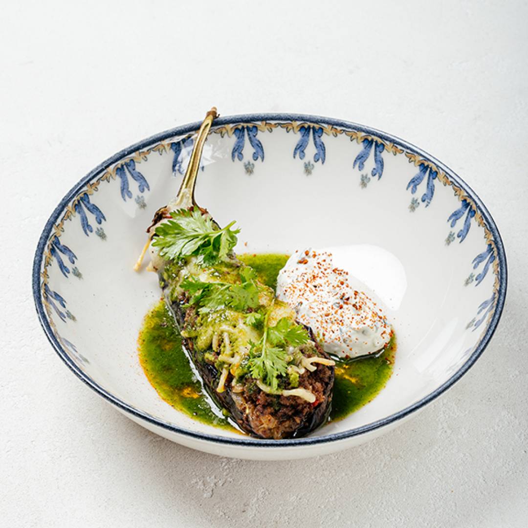 Баклажан, говяжий фарш, сыр сулугуни, лабне, кинза, зелёная заправка, специи
