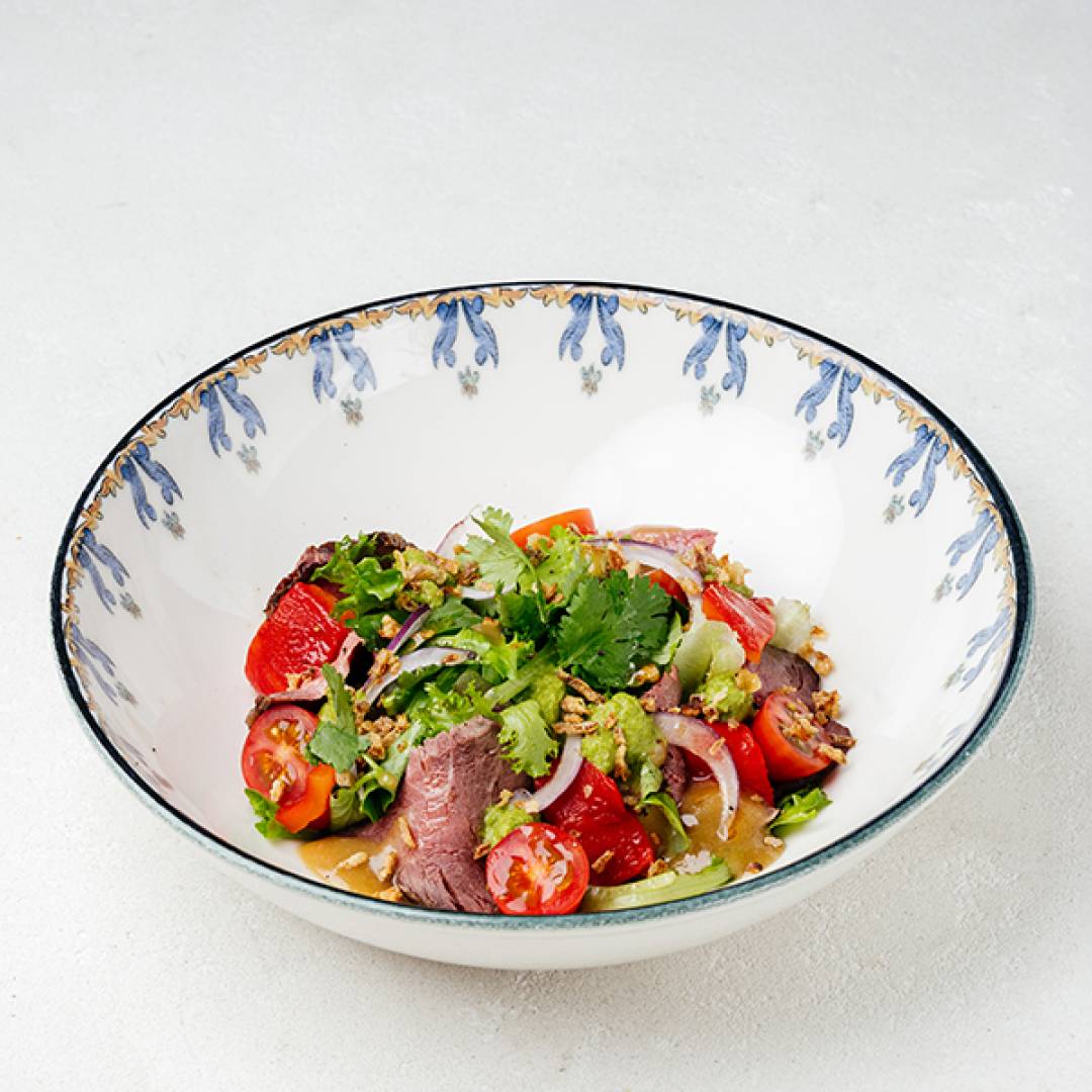 Ростбиф, микс зелени, перец рамиро, томаты черри, имбирная заправка, зелёный соус, лук фри