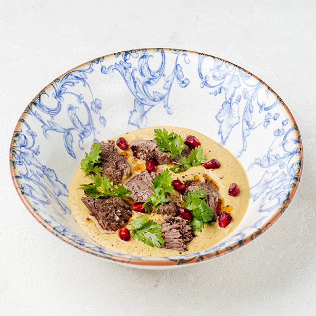 Соус сациви, говядина отварная, зёрна граната, кинза, масло аджики